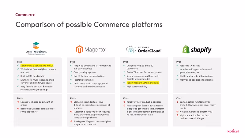 If you have a digital platform that needs updates, consider gradually switching to MACH solutions as opportunities arise. Start with a key piece, such as your e-commerce system, and compare the available options. We give you an example of eCommerce composable: