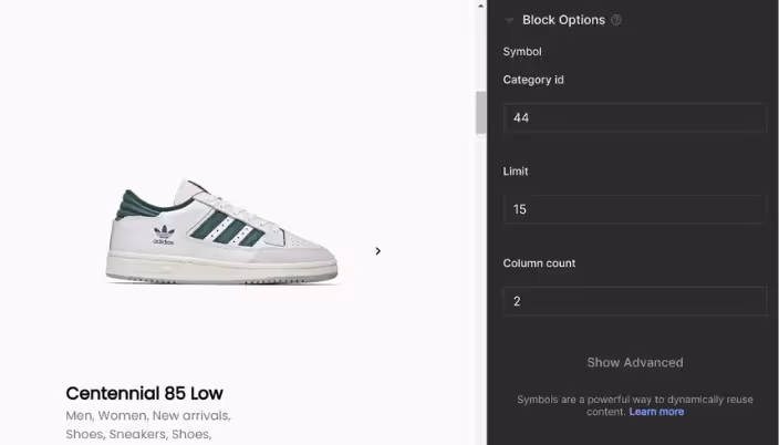 Through the API, you can insert and manage product and category data directly into the content. This allows you to easily create sections with featured products or links to categories.