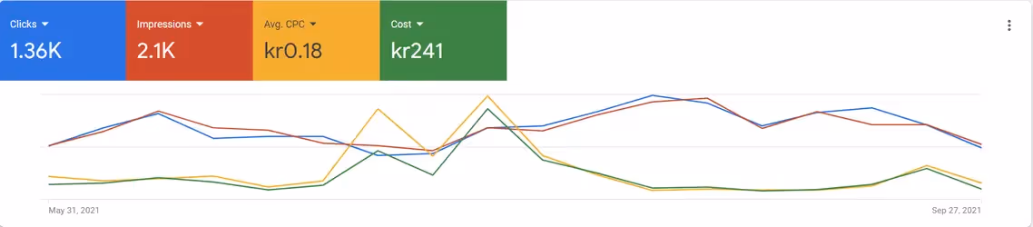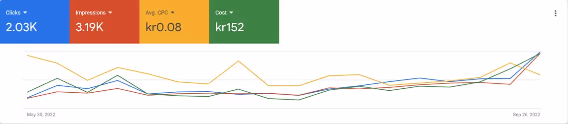 Example: An online store experiences an increase in impressions and clicks, and a reduction in CPC of more than 50%.