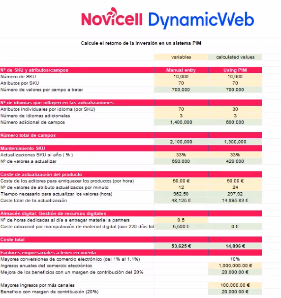 💡 Optimizing product data maintenance: By changing the variable fields for your own data, you can visualize the direct impact of implementing a PIM on reducing product management costs.
