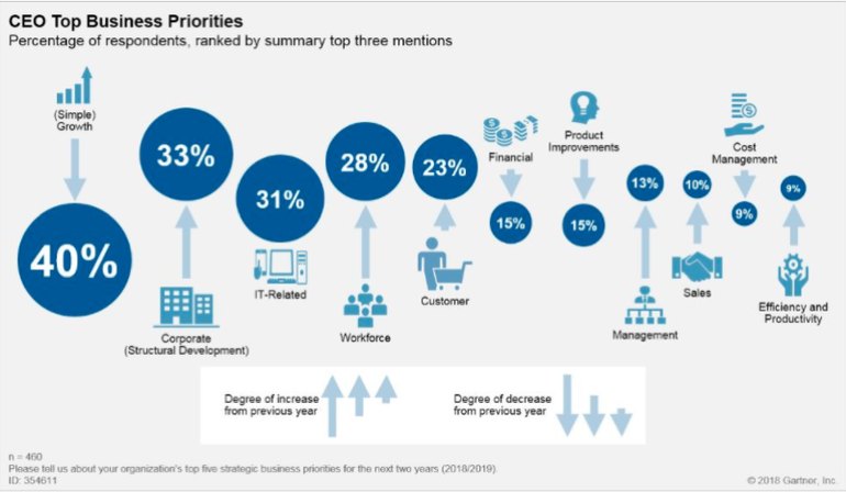 Las empresas a menudo olvidan los cambios organizacionales cuando se va a implementar una nueva estrategia digital. Según un estudio de Gartner sobre la prioridad de negocio de los CEO publicado en mayo de 2018, una de las principales prioridades es la transformación digital (se sitúa en la tercera posición). La encuesta fue realizada a 460 CEO; en este gráfico podemos observar el resumen de las prioridades de negocio (Fuente: Gartner).