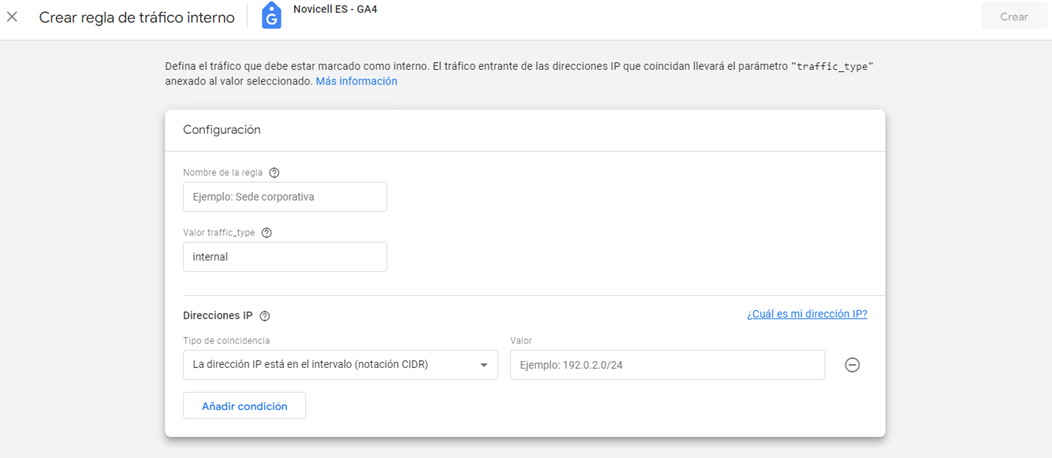 - Crea una regla para identificar el tráfico interno en su flujo de datos web.