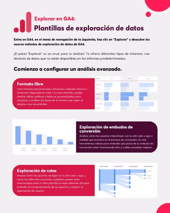 - Sacar el máximo partido a las herramientas avanzadas de GA4 para profundizar en el análisis y obtener información que no está disponible en los informes estándar.